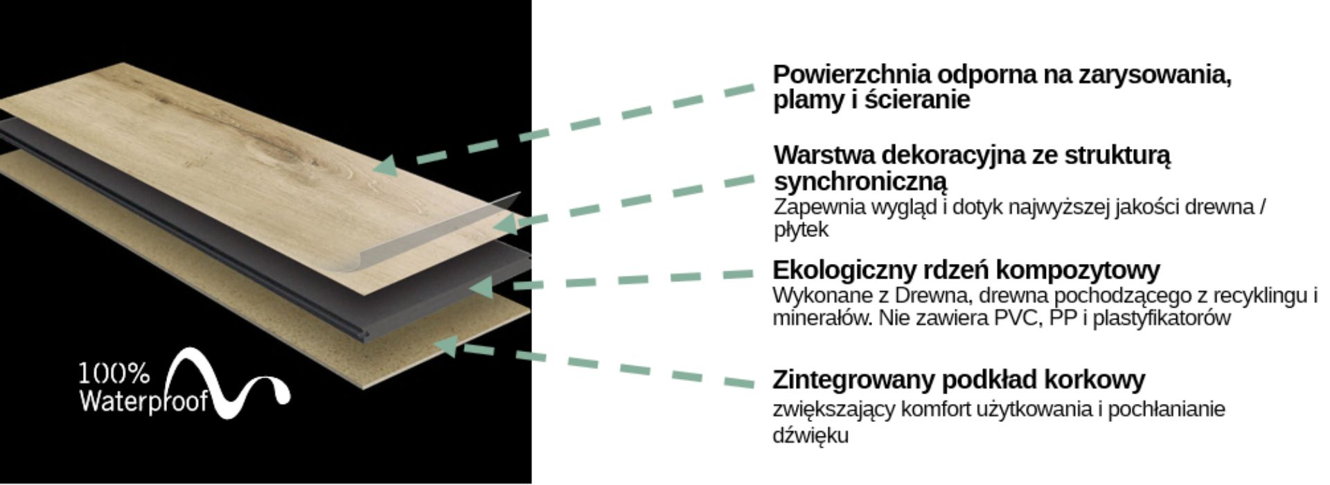 Podłogi Tenacity Eco Composite Flooring łączą ekologię i wytrzymałość dzięki powierzchni TriTec, która zapewnia nawet 10 razy większą odporność na zarysowania niż tradycyjne podłogi winylowe PVC. W pełni wodoodporne i odporne na plamy, są idealne do miejsc o dużym natężeniu ruchu, takich jak kuchnie i łazienki. Wykonane do 80% z naturalnych materiałów i 50% z materiałów pochodzących z recyklingu. Ich rdzeń bez PVC, PP i Plastyfikatorów jest zarówno przyjazny dla środowiska, jak i trwały, a podkład korkowy zmniejsza zużycie plastiku o do 15 kg na 100 m2 instalacji.
