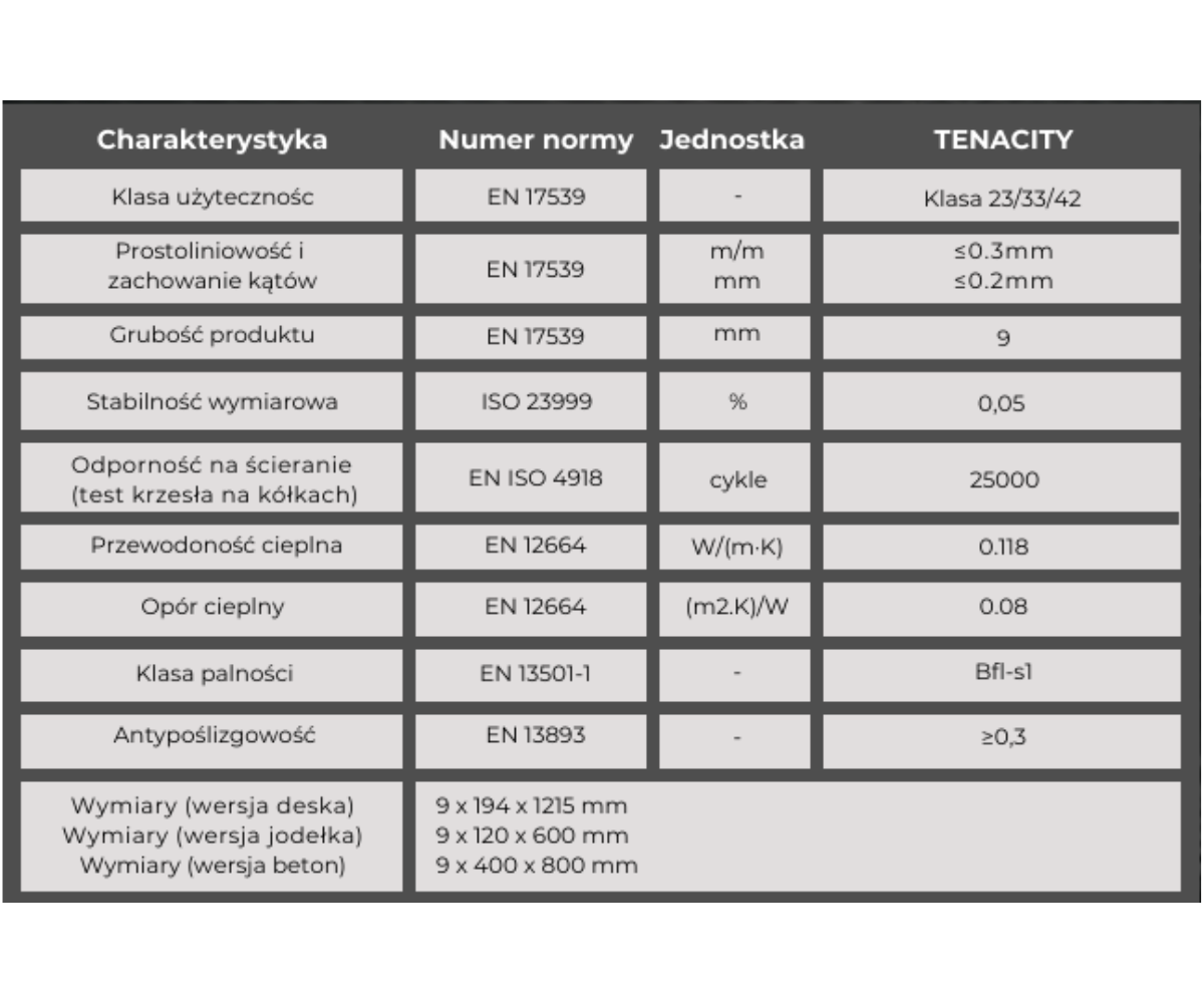 Idealne zarówno do przestrzeni mieszkalnych, jak i komercyjnych, podłogi Tenacity mają klasę 33, co oznacza dużą odporność na użytkowanie i umożliwia łatwą instalację na dużych powierzchniach bez konieczności stosowania listew przejściowych. Ich trwałość, stabilność i łatwość montażu sprawiają, że są idealnym wyborem do nowoczesnych wnętrz.